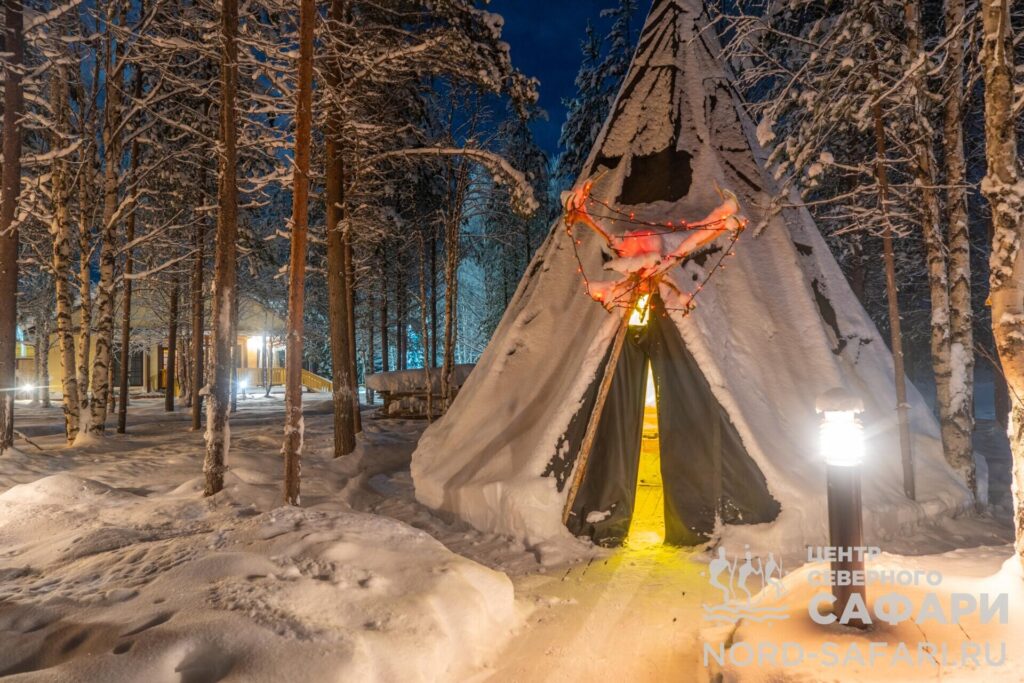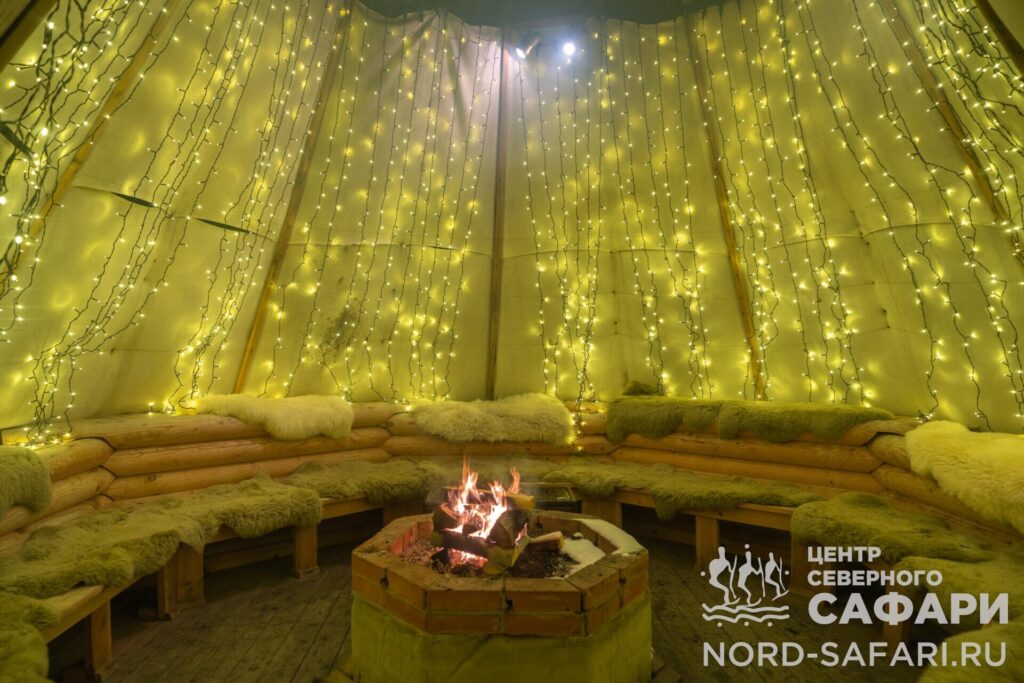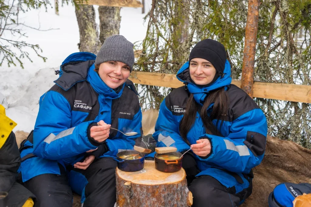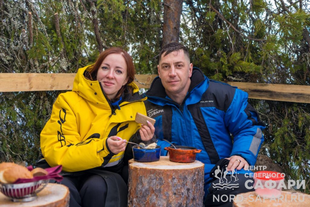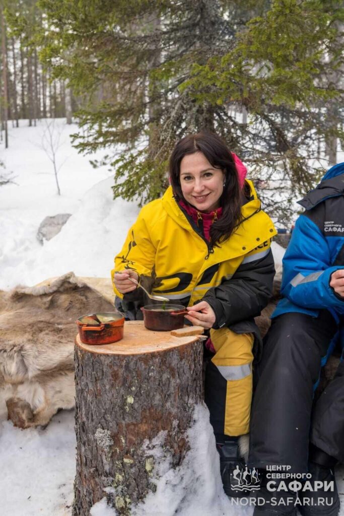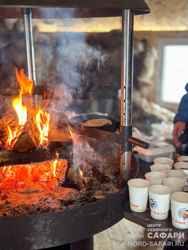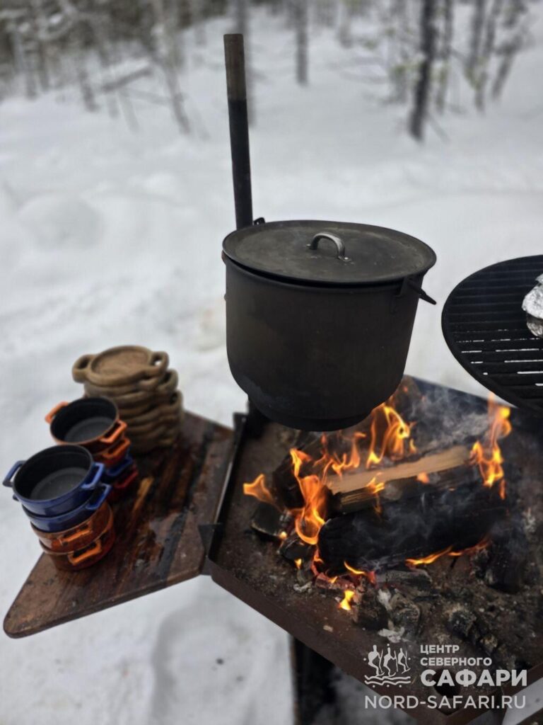Обед путешественникам предложат в лесному чуме у открытого огня. Это отдых в дальней дороге, погружение в быт и традиции коренных народов Севера, аппетитный горячий перекус, приготовленный из локальных продуктов.